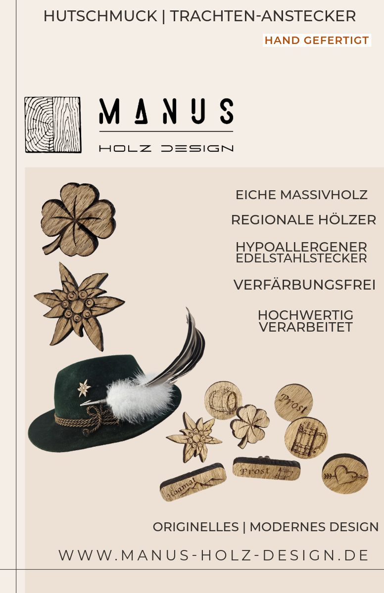 Entdecken Sie hochwertigen Hutschmuck und Trachten-Anstecker aus massivem Eichenholz – perfekt für die traditionelle Tracht. Jedes Stück ist ein handgefertigtes Unikat, voller Liebe zum Detail und zur Tradition. Die natürliche Schönheit des Eichenholzes verleiht Ihrer Tracht einen besonderen Charme und unterstreicht Ihre Verbundenheit zur Kultur. Egal ob für festliche Anlässe oder den Alltag in Tracht – diese Accessoires setzen stilvolle Akzente und runden Ihr Outfit harmonisch ab. Wählen Sie Qualität, Tradition und individuelle Handwerkskunst – gefertigt mit Liebe zur Tracht! Mit Hypoallergenem Edelstahlstecker auf der Rückseite, somit sind unserer Anstecker komplett verfärbungsfrei.